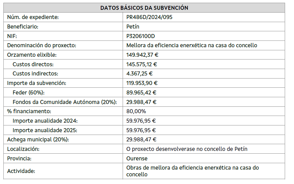 El Ayuntamiento de Petín resultó beneficiario de una ayuda en el marco de la Orden del 16 de enero de 2024 por la que se establecen las bases reguladoras y se convocan subvenciones, de carácter plurianual y en régimen de concurrencia competitiva, para la realización de obras de eficiencia energética en edificios e infraestructuras vinculados a la prestación de servicios municipales, destinadas a ayuntamientos de Galicia, cofinanciadas por la Unión Europea en el marco del programa Galicia Feder 2021-2027 (código de procedemiento PR486D); DOG nº 13, do 18 de enero)