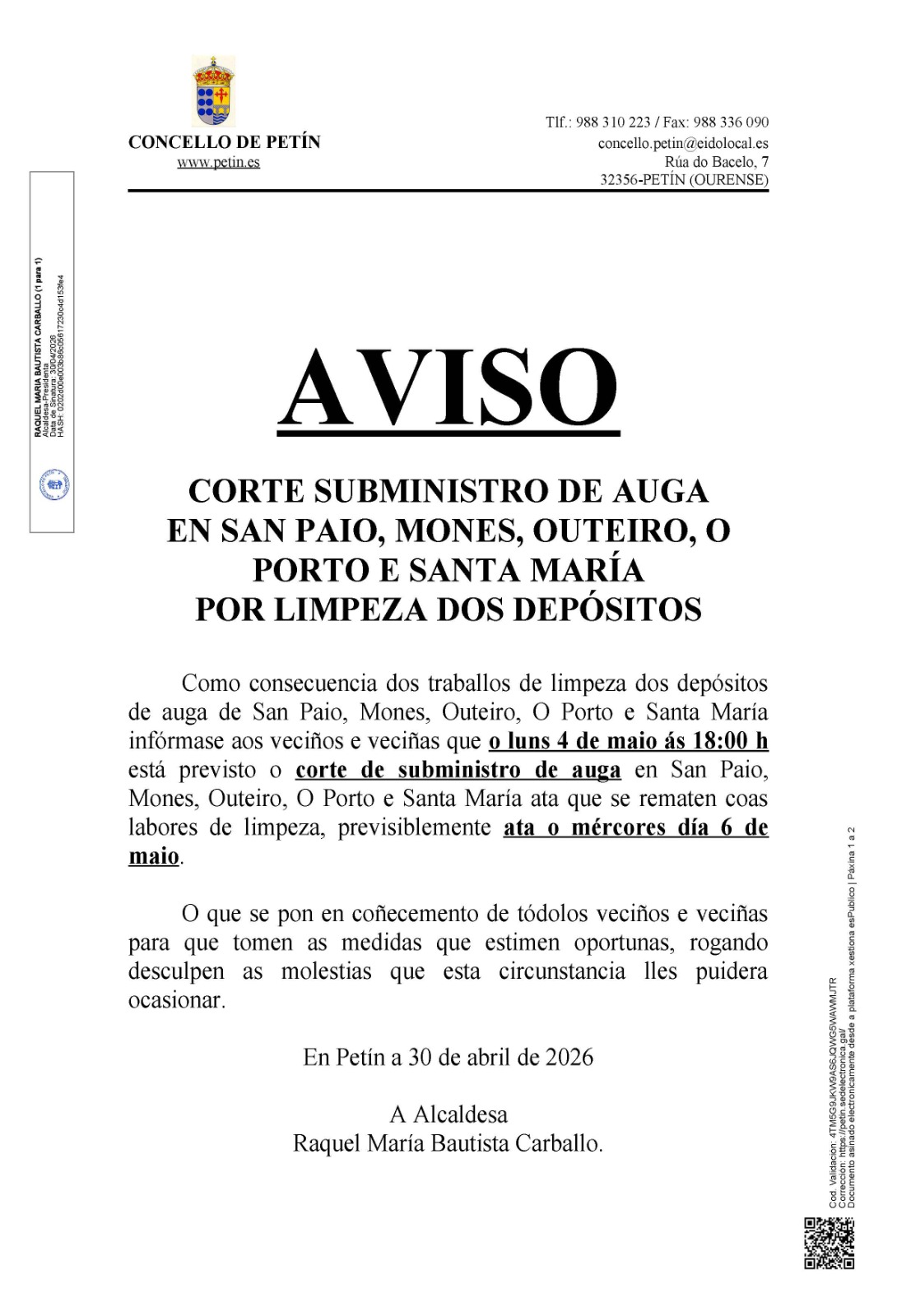 CORTE SUMINISTRO DE AGUA EN SAN PAIO, MONES, OUTEIRO, O PORTO Y SANTA MARÍA POR LIMPIEZA DE LOS DEPÓSITOS