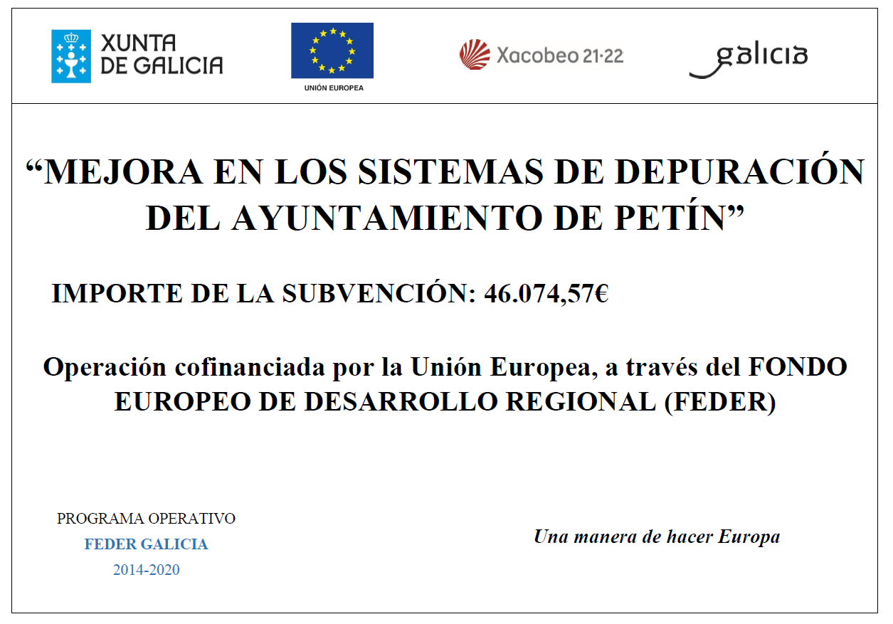 Esta obra está subvencionada al amparo de la Resolución del 12 de marzo de 2021 por la que se aprueban las bases reguladoras para la concesión de subvenciones a los ayuntamientos, en régimen de concurrencia competitiva, destinadas a la ejecución de obras de abastecimiento, saneamiento y depuración, financiadas en el marco del eje REACT-UE del programa operativo Feder Galicia 2014-2020.