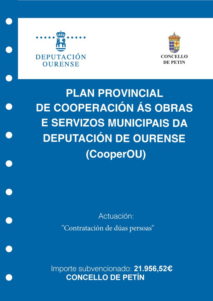 El Plan Provincial de Cooperación a las Obras y Servicios Municipales (CooperOU) de la Diputación de Ourense abarca subvenciones para financiar parcialmente inversiones concretas de competencias municipales. En este 2025 estas fueron las actuaciones ejecutadas en Petín: